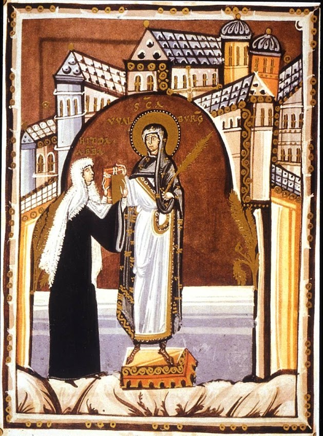 La iluminación representa a la propia Hitda con un vestido negro y un velo con cordones blancos, presentando un libro costoso a una estatua de San Walburga, la santa patrona de Meschede. Su interacción tiene lugar debajo de una elaborada superestructura arquitectónica de la iglesia. San Walburga fue una abadesa del siglo VIII del monasterio de Heidenheim. Fue venerada como protectora contra el hambre y la peste, y su culto se extendió por Alemania, Flandes y Francia. La imagen evoca un marfil bizantino que representa la coronación del emperador Otto II y la emperatriz Teófano, y reconoce conscientemente la posición superior aristocrática y espiritual que la abadesa tenía sobre la congregación de clérigos y parroquias subordinadas pertenecientes a la fundación, también como sobre la comunidad de hermanas.